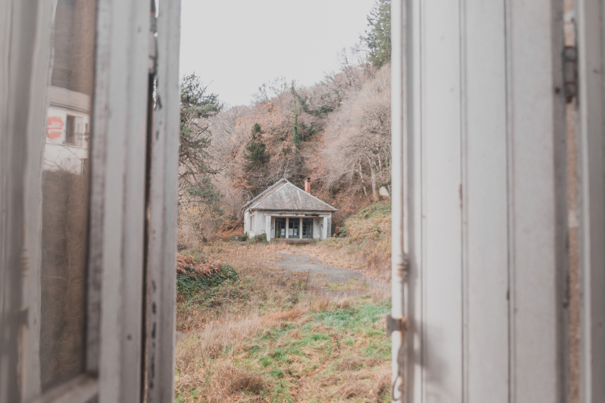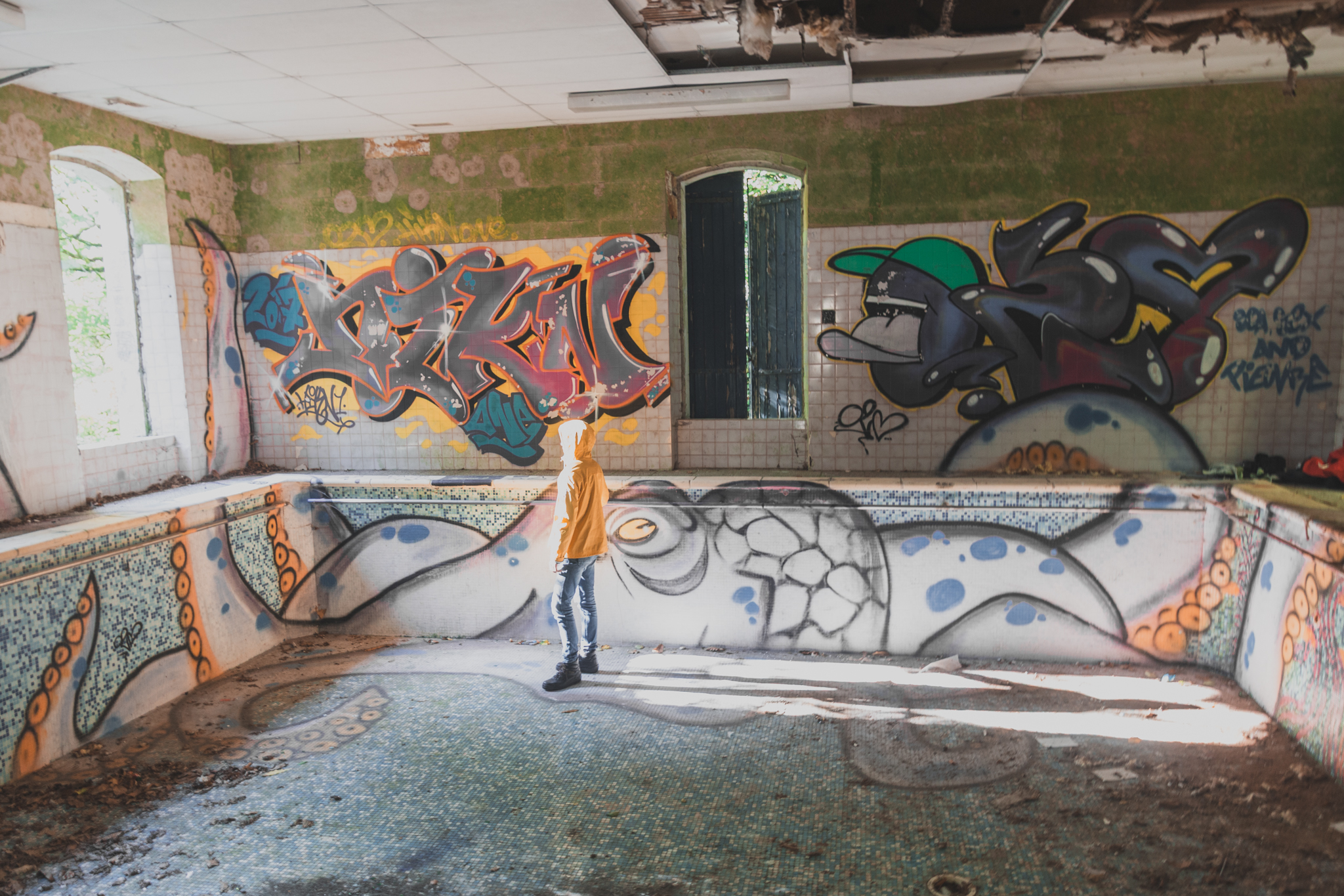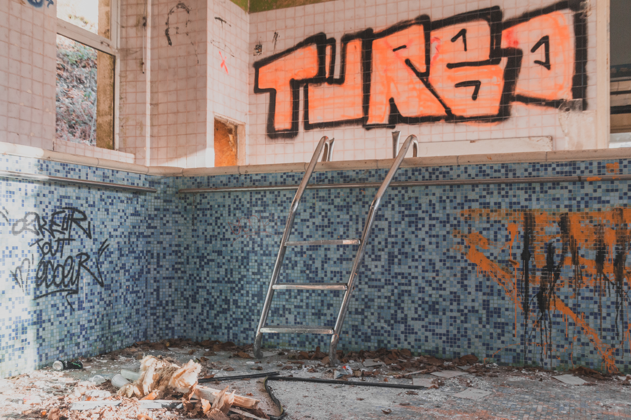Notre périple commence par la piscine, isolée du bâtiment principal. Elle a malheureusement subi les affres du temps et du vandalisme. Pourtant, en observant son bassin dégradé, on imagine sans peine l'époque où ce lieu n'était pas un "spot" de photo, mais un aérium.