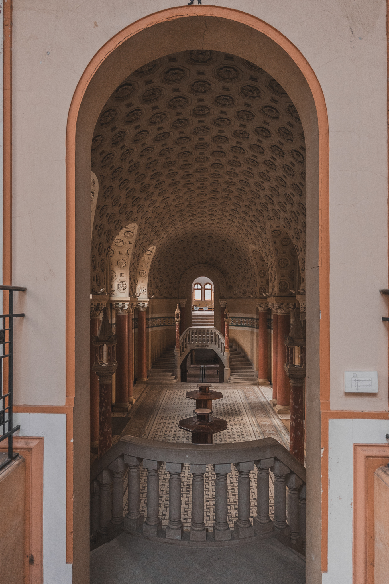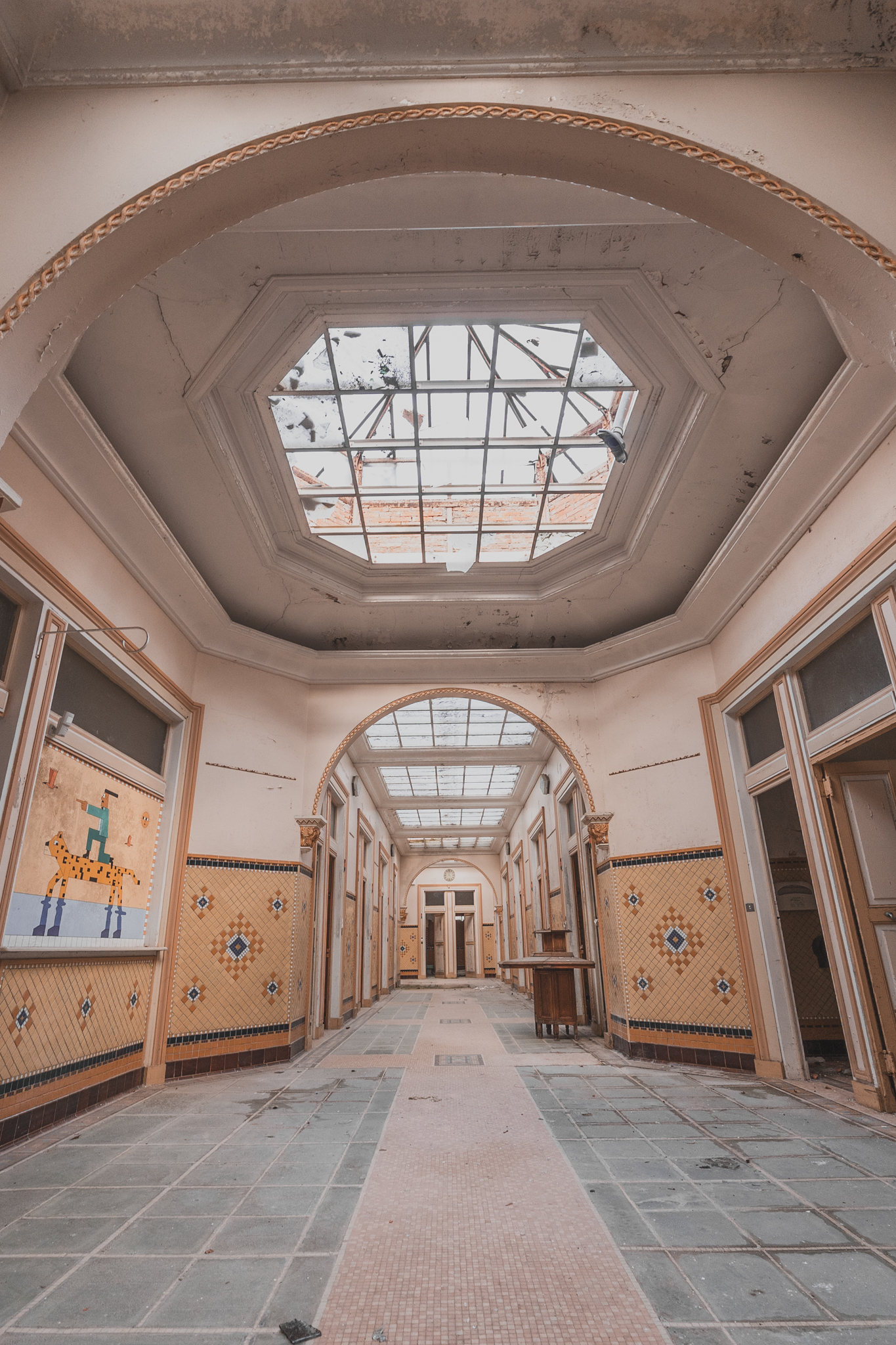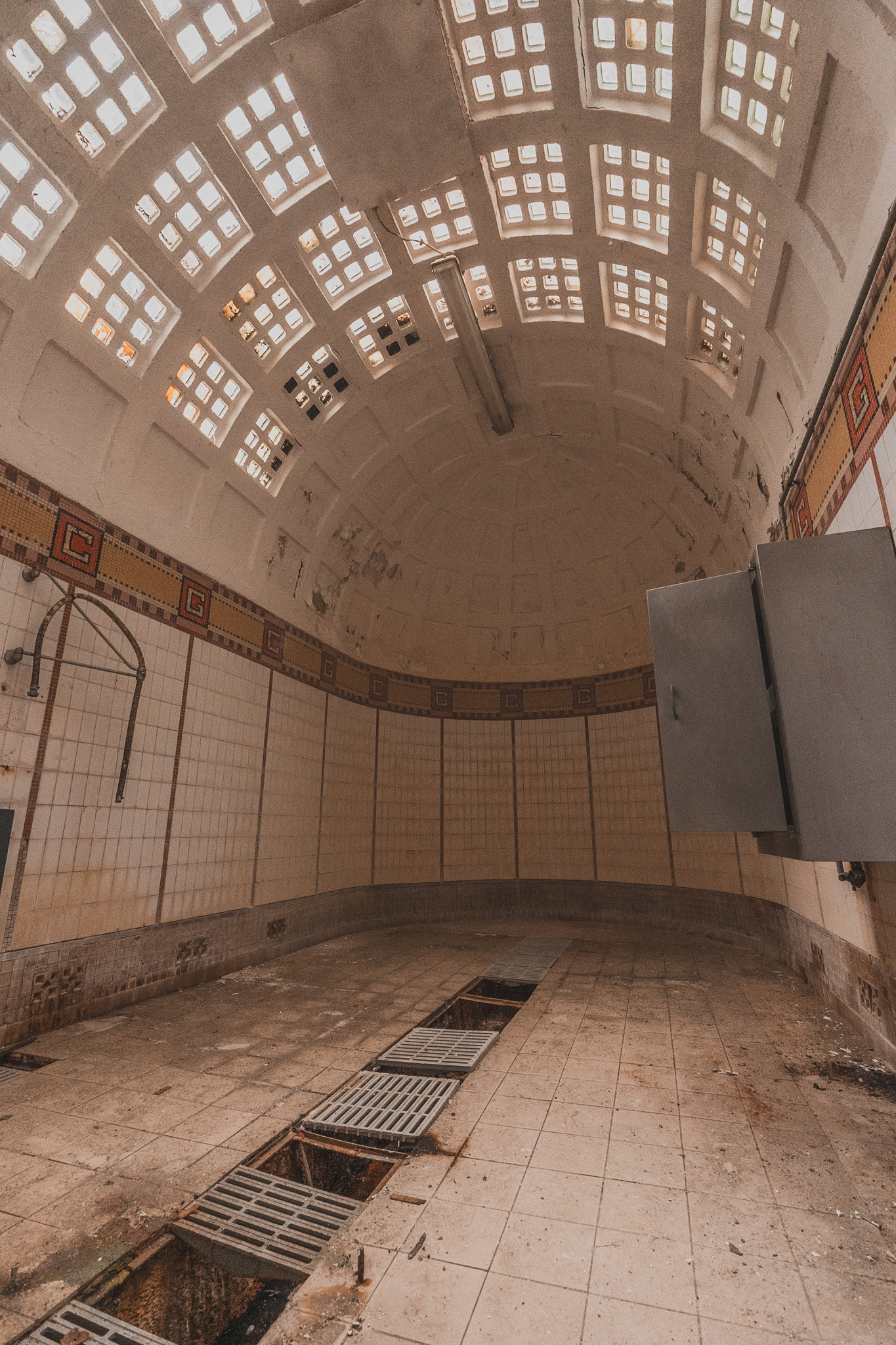 Une fois à l'intérieur, le contraste est saisissant. Les étages supérieurs baignent dans une luminosité incroyable, révélant une conservation exceptionnelle. Les perspectives sont parfaites, les mosaïques intactes. On croirait presque que les curistes viennent de quitter les lieux, et pourtant, le silence dure depuis vingt ans.
