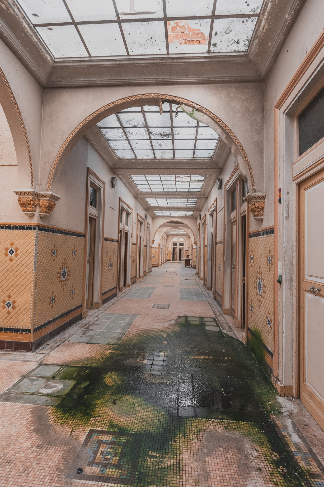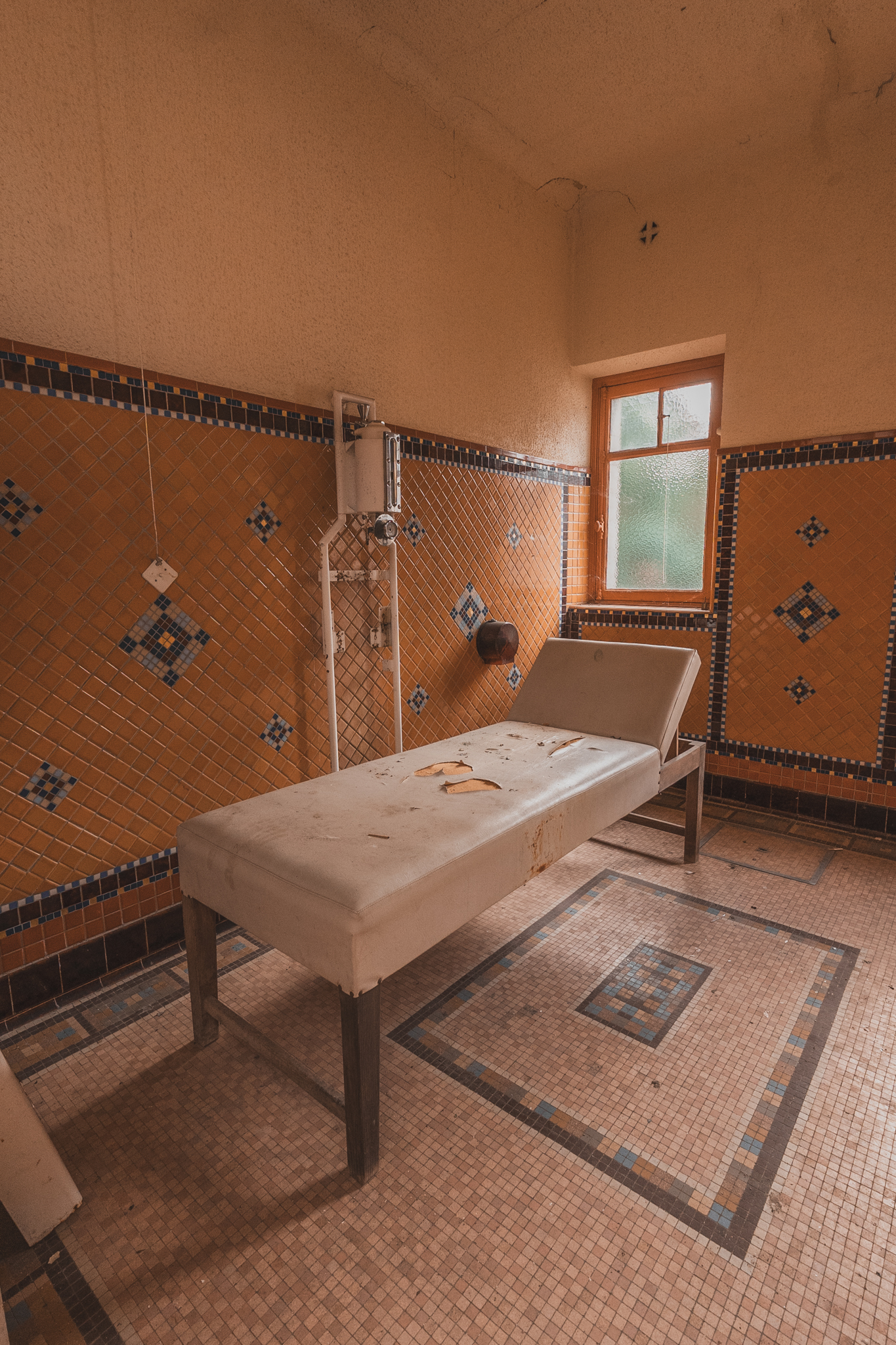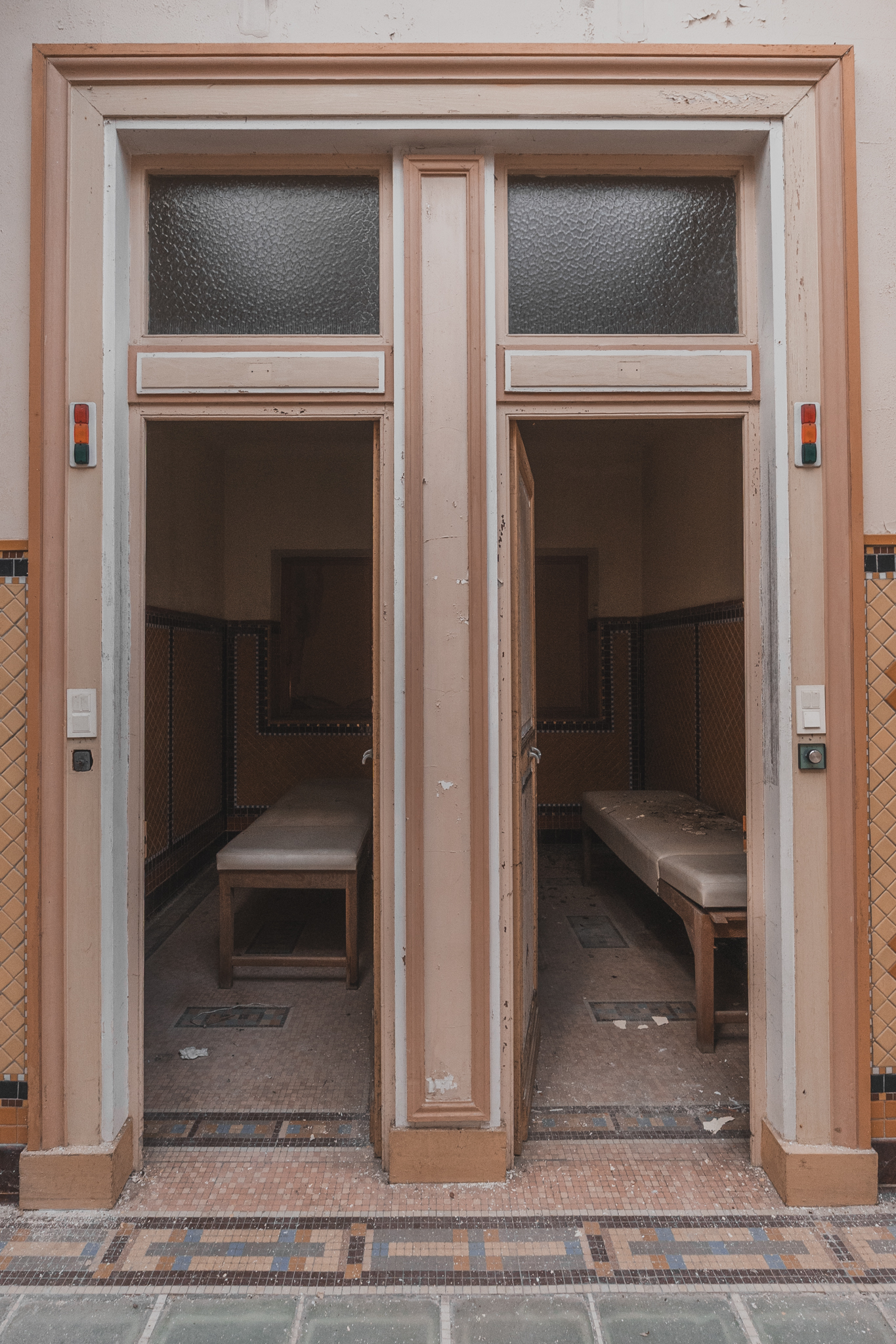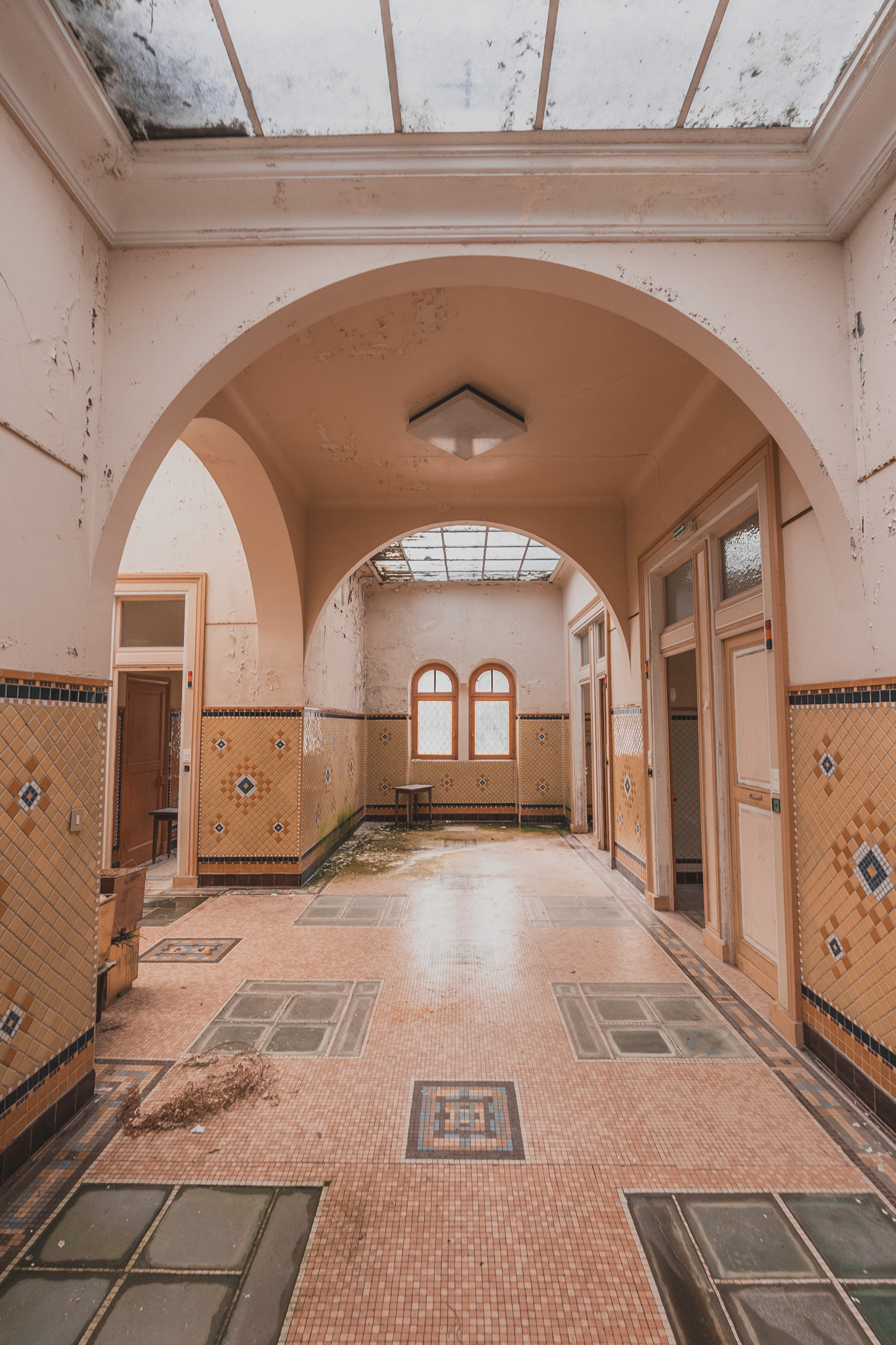 Une fois à l'intérieur, le contraste est saisissant. Les étages supérieurs baignent dans une luminosité incroyable, révélant une conservation exceptionnelle. Les perspectives sont parfaites, les mosaïques intactes. On croirait presque que les curistes viennent de quitter les lieux, et pourtant, le silence dure depuis vingt ans.