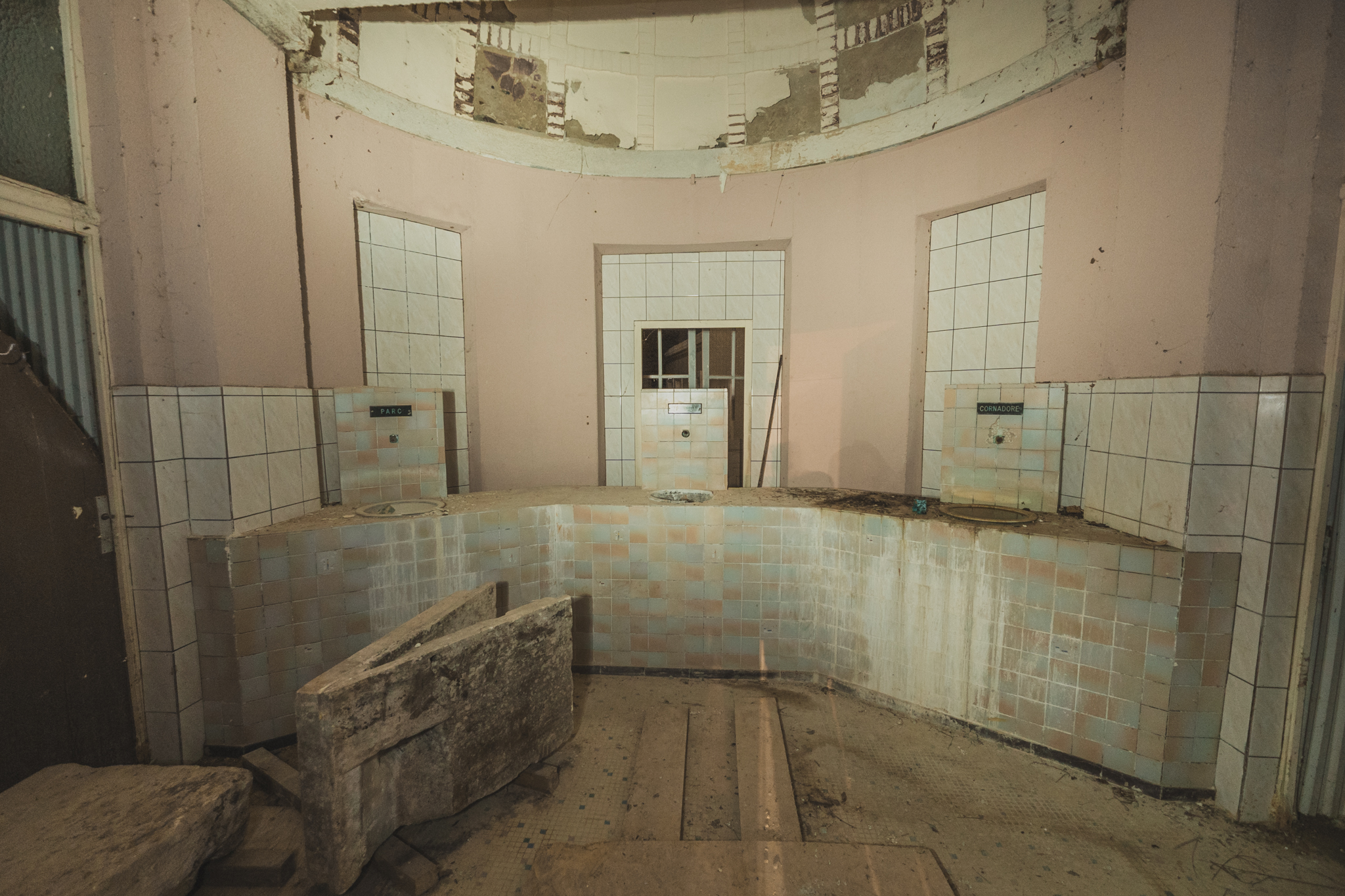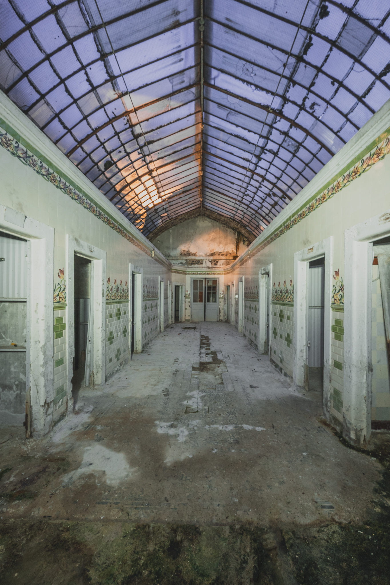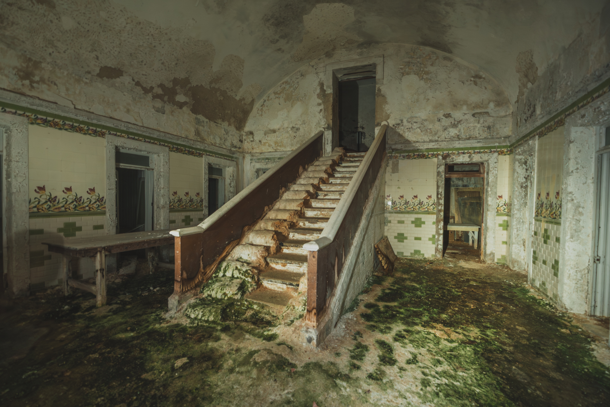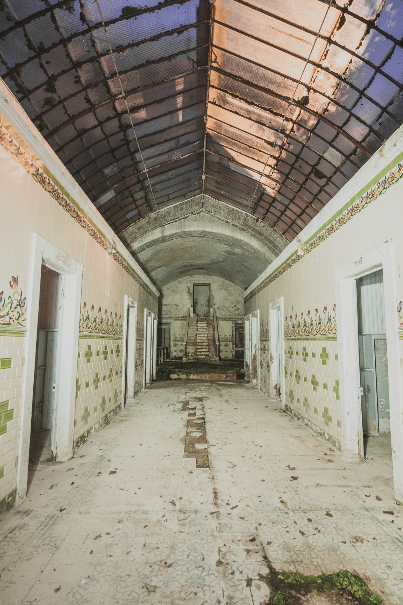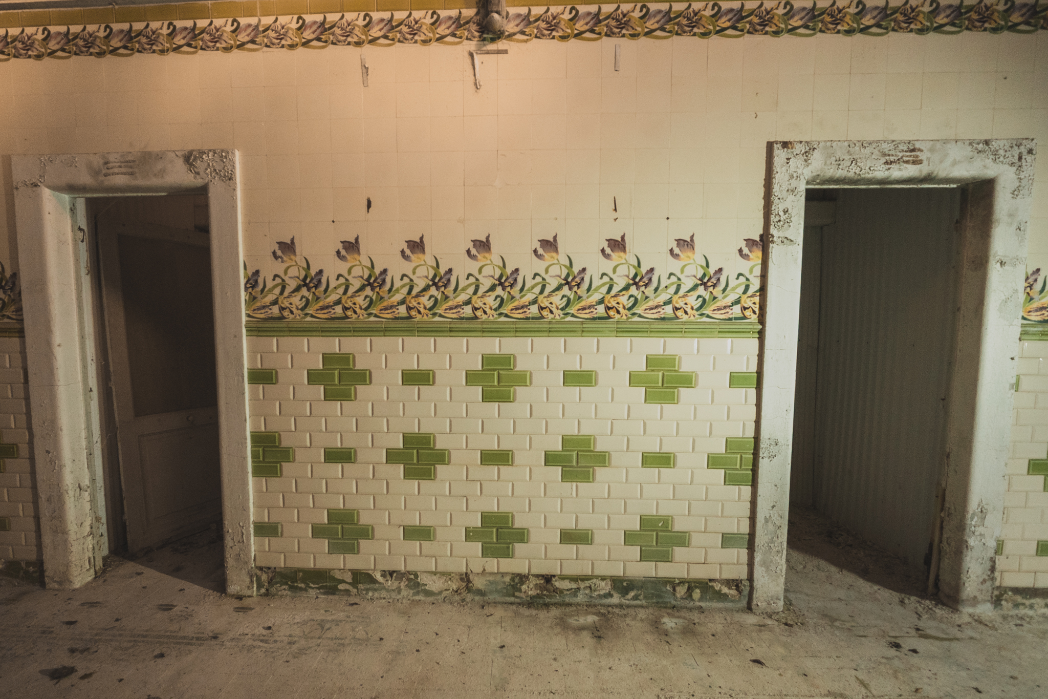 Nous progressons vers l'arrière, là où se cachent encore la salle de pulvérisation et celle de la source. Dans la galerie qui distribuait autrefois les cabines de bains, les motifs de faïences vertes qui ont donné leur nom au lieu s’effacent lentement sous cette gangue minérale. Sous nos pieds, le carrelage à frise florale disparaît sous le limon, offrant le spectacle d'une nature qui digère patiemment le luxe d'antan.